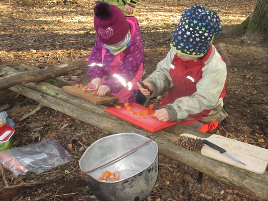 Im zweiten Semester bleiben wir viermal über Mittag im Wald und kochen auf dem Feuer. Dabei helfen die Kinder die Zutaten zu schälen, zu schneiden und ein Feuer zu machen. Wir werden von 08.30 bis 13.30 Uhr unterwegs sein. Wir freuen uns auf mehr Zeit im Wald und feine Waldgerichte.